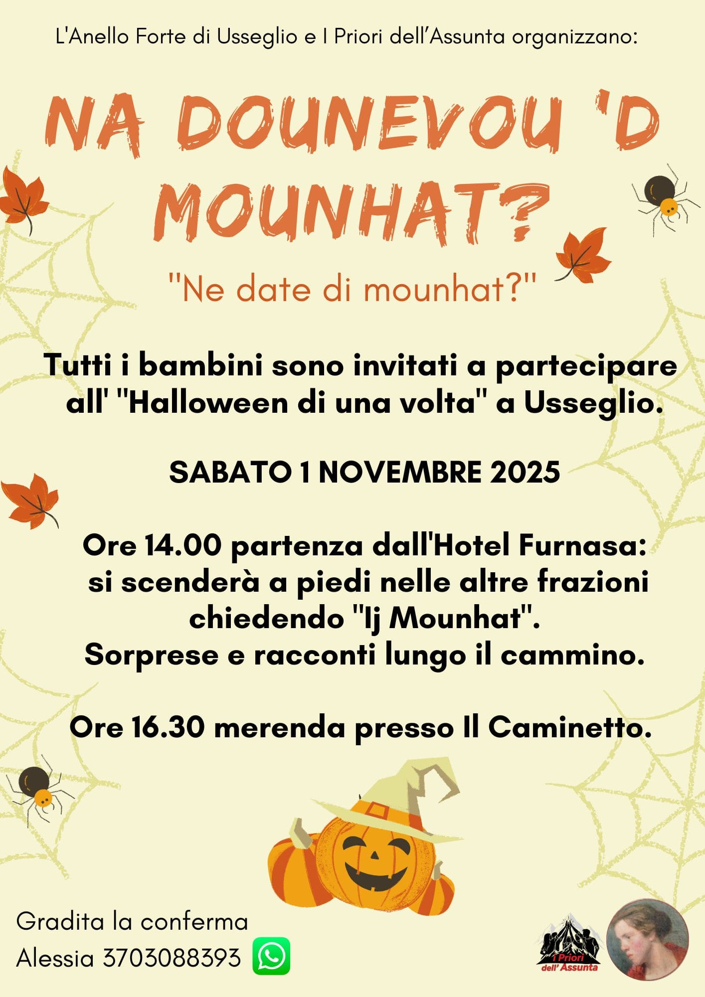 Torna l'attesissimo giro tra le frazioni alla ricerca di "MOUNHAT". Non un semplice Halloween, ma un tuffo nelle tradizioni di Usseglio. Tante sorprese per bambine e bambini presenti! L'evento è gratuito, in collaborazione con L'ANELLO FORTE DI USSEGLIO E